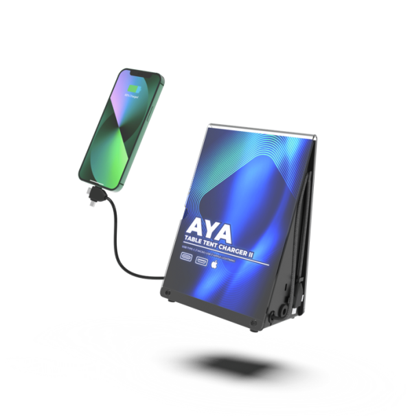 Το AYA είναι ο ιδανικός φορτιστής για επιχειρήσεις που πρέπει να εξοικονομούν χώρο και να παρέχουν φόρτιση μακριά από πρίζα. Το μοντέλο έχει σχεδιαστεί ειδικά για να προσφέρει υπηρεσίες φόρτισης σε μέρη όπως νοσοκομεία, σαλόνια αναμονής, αίθουσες συσκέψεων, γραφεία, εστιατόρια, ξενοδοχεία, καφετέριες γυμναστήρια κ.λπ. Διαθέτει μπαταρία υψηλής χωρητικότητας 10.000 mAh ώστε να μπορείτε να τοποθετήσετε αυτή τη μονάδα οπουδήποτε για φόρτιση στους καλεσμένους σας. Με κομψό σχεδιασμό και κατασκευή από ανθεκτικό πλαστικό, το ΑΥΑ έχει ενσωματωμένα 2 καλώδια φόρτισης συμβατά με όλα τα σημερινά smartphone.Έχει τη δυνατότητα να προσαρμοστεί στις δικές σας προδιαγραφές με branding της συσκευής π.χ. με χρήση λογοτύπου ή άλλου εικαστικού.